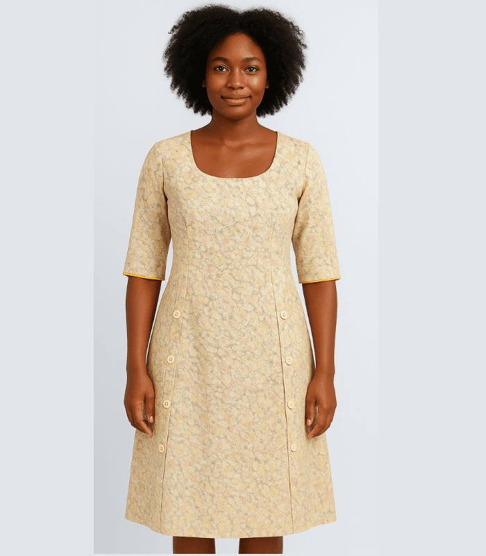 The Leda Dress buttons you into comfort. With easy openings and a quietly tailored fit, it is made to revolve around your day, however it unfolds.