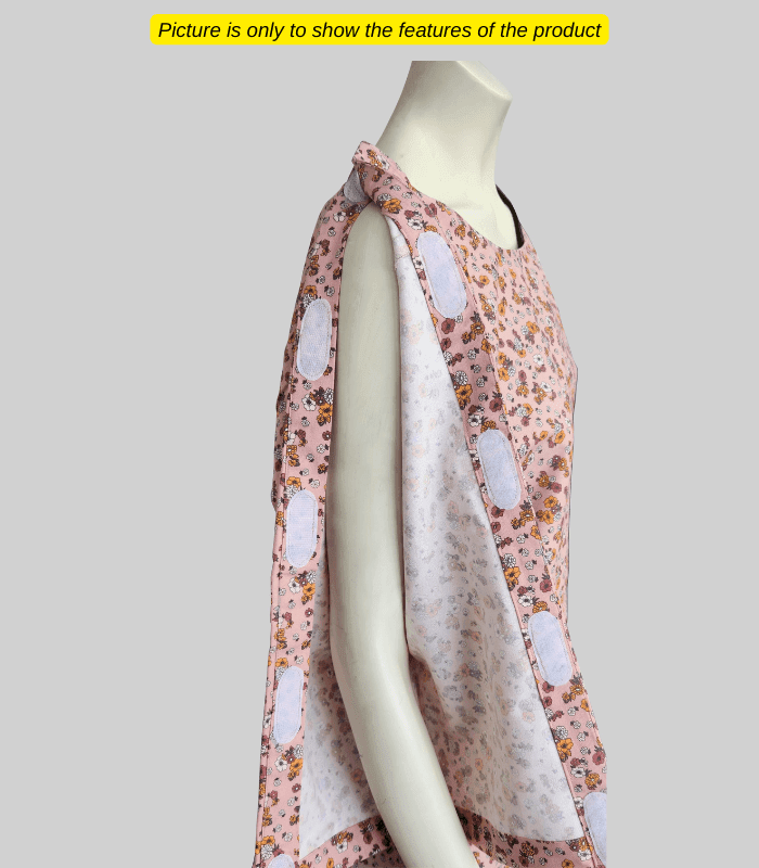 A versatile dress that features Velcro for easy above-waist access and front buttons for convenient lower-body accessibility, offering both practicality and elegance. Opens from the shoulder to the end of the sleeves for easy accessibility